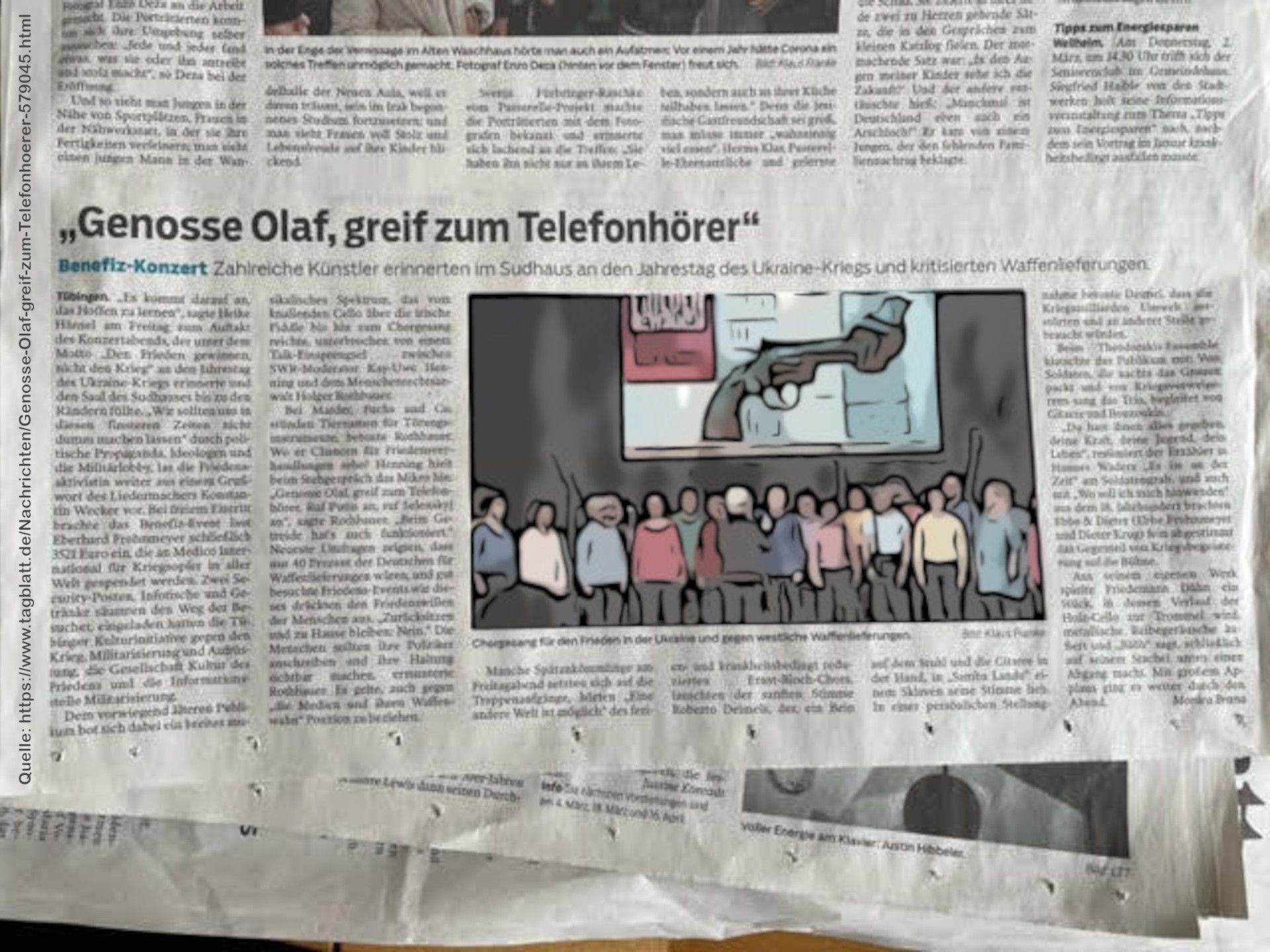 Ironischerweise veröffentlicht dann das Schwäbische Tagblatt einen Tag nach dem Konzert einen Bericht, bei dem genau unter unserem Bild steht, dass wir gegen die (westlichen) Waffenlieferungen ansingen: