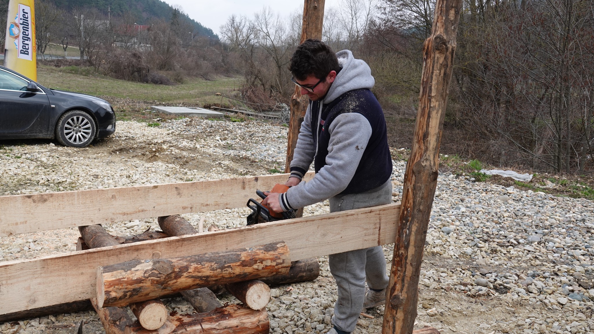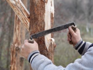 Hier arbeiten gerade ein paar fleißige Handwerker: Sowohl modern mit Kettensäge …