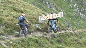Tja, das war’s dann wohl mit Abfahren: Ich baue also wieder alles zusammen und jogge mit dem Rad ins Tal.